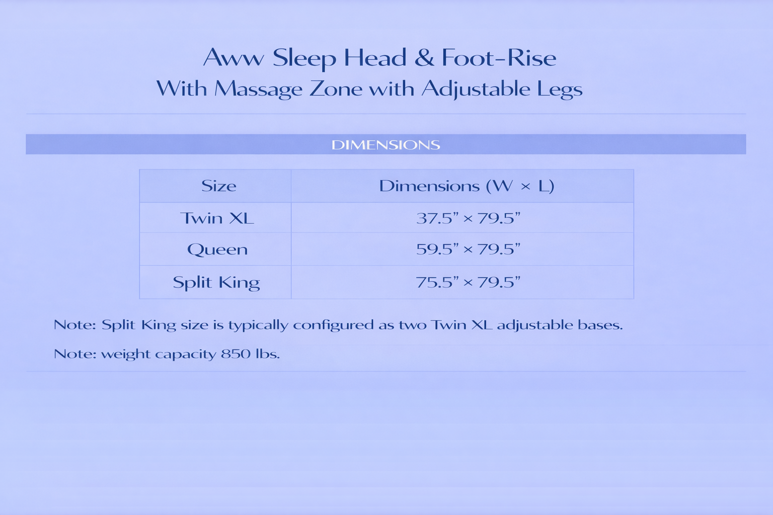 The Aww Sleep Adjustable Base offers independent adjustment for the head and Feet sections.